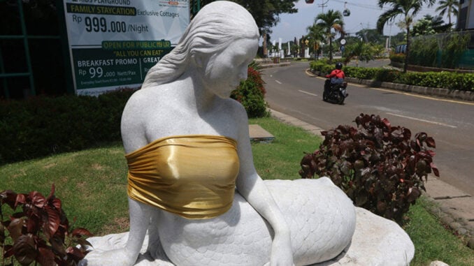 Dünyanın en büyük Müslüman nüfusa sahip ülkesi olarak bilinen Endonezya’nın başkenti Cakarta’daki Ancol Dreamland adlı eğlence parkında yaklaşık 15 yıldır bulunan deniz kızı heykellerinin çıplak göğüsleri altın renginde bezlerle kapatıldı.