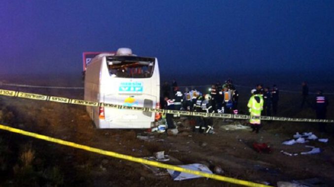 Kaza, saat 05.30 sıralarında Aksaray – Ankara karayolunun 35. kilometresinde meydana geldi. Edinilen bilgiye göre, İstanbul Mersin seferini yapan Muzaffer İ. (62) idaresindeki 33 DK 060 plakalı yolcu otobüsü, Aksaray’a 35 kilometre kala sisli havada sürücüsünün direksiyon hakimiyetini kaybetmesi sonucu kontrolden çıkarak şarampole devrildi. 8’i çocuk 48 yolcu ve 4 mürettebat olmak üzere toplam 52 kişinin bulunduğu otobüste 1 kişi olay yerinde hayatını kaybederken, 51 kişi de yaralandı. Kaza ihbarı üzerine olay yerine çok sayıda ambulans ve kurtarma ekibi sevk edildi. Aksaray Acil Afet Durum (AFAD) Müdürlüğü, Ulusal Medikal Kurtarma (UMKE) ekibi, Aksaray Belediyesi İtfaiye Müdürlüğü ekipleri ve 112 Acil Yardım ekipleri kısa sürede olay yerine intikal ederek kazaya müdahale etti. Polis ve jandarma ekiplerinin karayolunda geniş güvenlik önlemleri aldığı kazada yaralılar kurtarma ekipleri tarafından ambulanslara taşındı. Aksaray Şoförler Cemiyeti kurtarma aracı ise devrilen otobüsü kaldırırken, kurtarma ekipleri otobüs altında arama çalışması yaptı. Yaralılar Aksaray Üniversitesi Eğitim ve Araştırma Hastanesi başta olmak üzere kentte bulunan özel hastanelere kaldırılarak tedavi altına alınırken, 9 yaralının durumunun ağır olduğu öğrenildi. Olay yerinde hayatını kaybeden bir yolcunun henüz kimliği belirlenemezken, kazayla ilgili soruşturma başlatıldı.